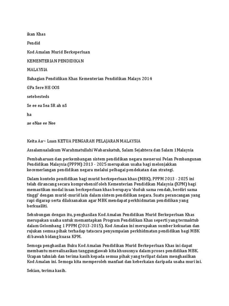 Interested in flipbooks about kod amalan pendidikan khas? Soalan peperiksaan pertengahan tahun 2013. Pendidikan karakter adalah pemberian pandangan mengenai berbagai jenis nilai hidup, seperti kejujuran, kecerdasan, kepedulian, tanggung jawab, kebenaran, keindahan, kebaikan, dan keimanan. Sila pastikan anda membuat ringkasan nota menggunakan 'mind mapping notes' dan bincangkan dengan ahli kumpulan anda untuk membuat pembentangan mini di kelas berikutnya. Persembahan kod tangan para pelajar dari sek.
